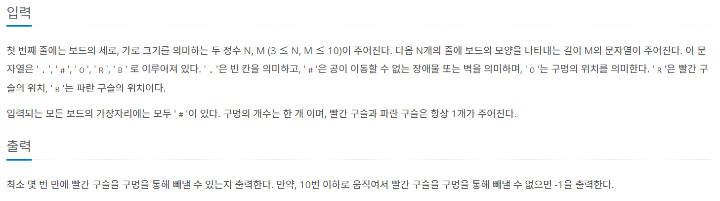 첫 번째 줄에는 보드의 세로, 가로 크기를 의미하는 두 정수 N, M (3 ≤ N, M ≤ 10)이 주어진다. 다음 N개의 줄에 보드의 모양을 나타내는 길이 M의 문자열이 주어진다. 이 문자열은 '.', '#', 'O', 'R', 'B' 로 이루어져 있다. '.'은 빈 칸을 의미하고, '#'은 공이 이동할 수 없는 장애물 또는 벽을 의미하며, 'O'는 구멍의 위치를 의미한다. 'R'은 빨간 구슬의 위치, 'B'는 파란 구슬의 위치이다. 입력되는 모든 보드
