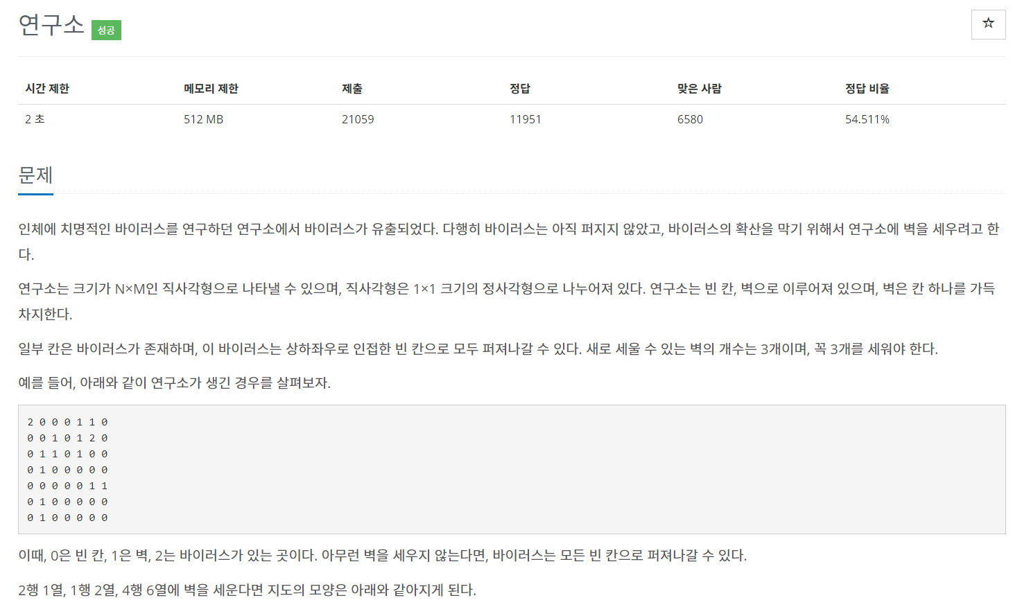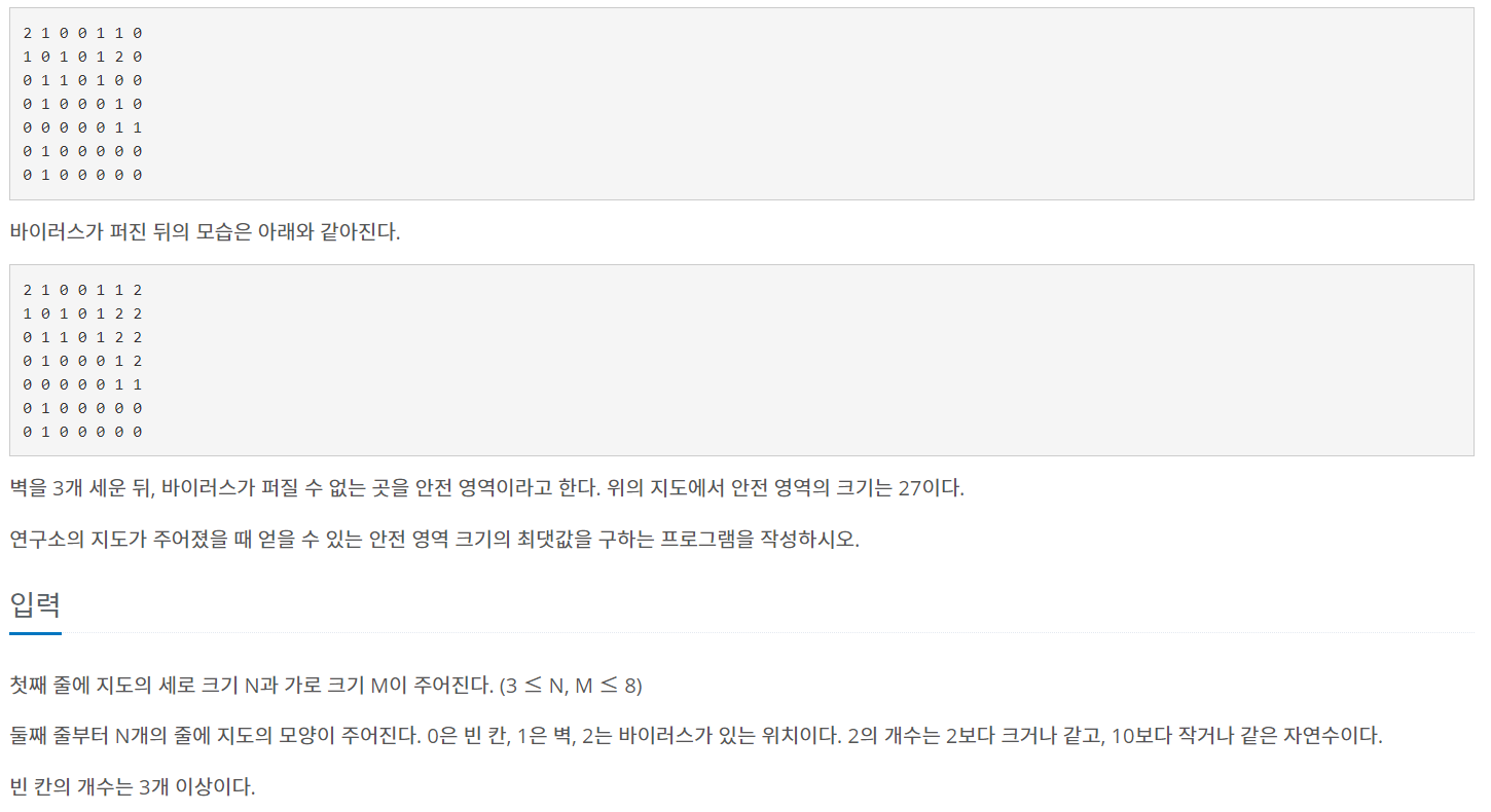 인체에 치명적인 바이러스를 연구하던 연구소에서 바이러스가 유출되었다. 다행히 바이러스는 아직 퍼지지 않았고, 바이러스의 확산을 막기 위해서 연구소에 벽을 세우려고 한다. 연구소는 크기가 N×M인 직사각형으로 나타낼 수 있으며, 직사각형은 1×1 크기의 정사각형으로 나누어져 있다. 연구소는 빈 칸, 벽으로 이루어져 있으며, 벽은 칸 하나를 가득 차지한다. 일부 칸은 바이러스가 존재하며, 이 바이러스는 상하좌우로 인접한 빈 칸으로 모두 퍼져나갈 수 있다.