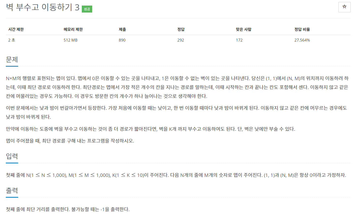 - 추가된 조건은, 이동하지 않고 같은 칸에 머무르는 경우에도 낮과 밤이 바뀌게 된다를 처리해 주어야 한다. 처음에는 해당 조건을 처리하기 위해 현재 밤일 경우 다음 칸의 밤 이동 거리를 + 2 해주었는데 정답이 아닌듯. 그냥 가만히 있는 경우로 처리 하여야 한다.