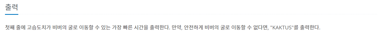 문제 사악한 암흑의 군주 이민혁은 드디어 마법 구슬을 손에 넣었고, 그 능력을 실험해보기 위해 근처의 티떱숲에 홍수를 일으키려고 한다. 이 숲에는 고슴도치가 한 마리 살고 있다. 고슴도치는 제일 친한 친구인 비버의 굴로 가능한 빨리 도망가 홍수를 피하려고 한다. 티떱숲의 지도는 R행 C열로 이루어져 있다. 비어있는 곳은 '.'로 표시되어 있고, 물이 차있는 지역은 '*', 돌은 'X'로 표시되어 있다. 비버의 굴은 'D'로, 고슴도치의 위치는 'S'로 나