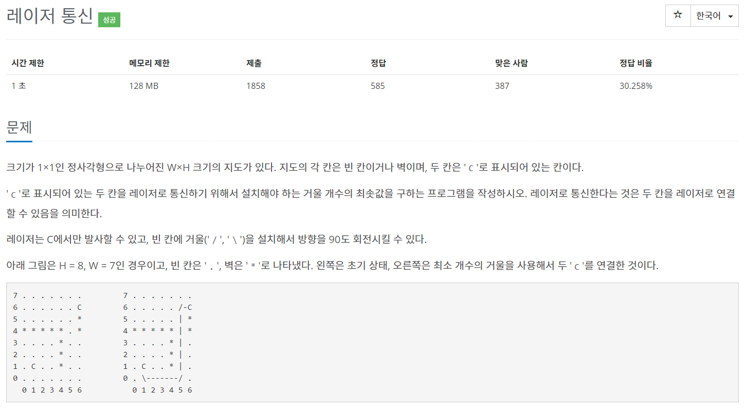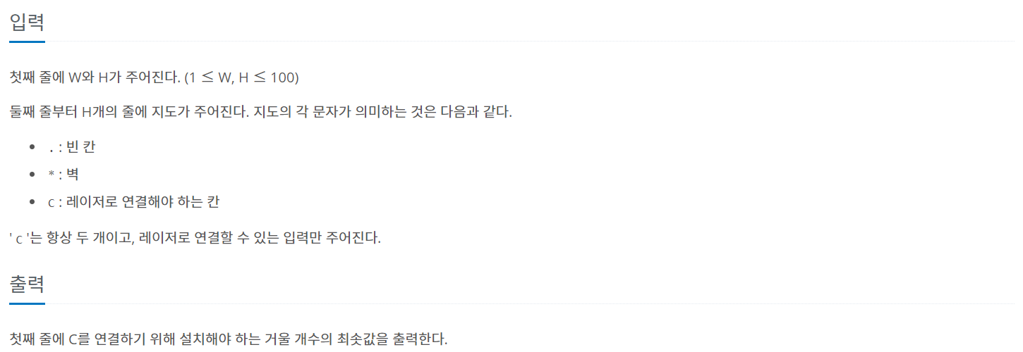 문제 크기가 1×1인 정사각형으로 나누어진 W×H 크기의 지도가 있다. 지도의 각 칸은 빈 칸이거나 벽이며, 두 칸은 'C'로 표시되어 있는 칸이다. 'C'로 표시되어 있는 두 칸을 레이저로 통신하기 위해서 설치해야 하는 거울 개수의 최솟값을 구하는 프로그램을 작성하시오. 레이저로 통신한다는 것은 두 칸을 레이저로 연결할 수 있음을 의미한다. 레이저는 C에서만 발사할 수 있고, 빈 칸에 거울('/', '\')을 설치해서 방향을 90도 회전시킬 수 있다.