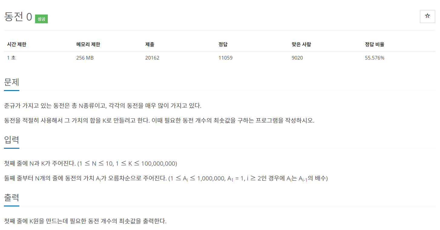 - 이 문제의 조건에서는 주어지는 동전이 Ai는 Ai-1의 배수라고 했으므로, 그리디 알고리즘을 사용하여 풀 수 있다.