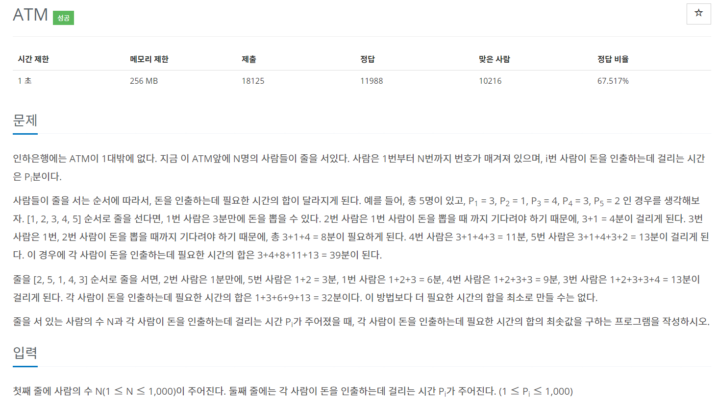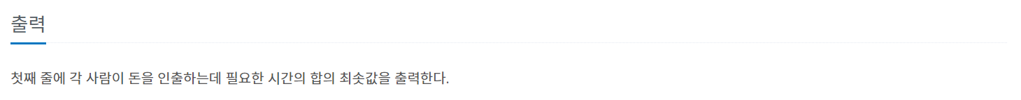: t1 ~ t5는 1~5번 사람이 돈을 인출하는데 걸리는 시간이며, P1 ~ P5는 각 사람이 돈을 인출 완료하기까지 기다려야 하는 시간, 각 번호는 t가 작은 순으로 오름차순으로 정렬되어있다고 가정.