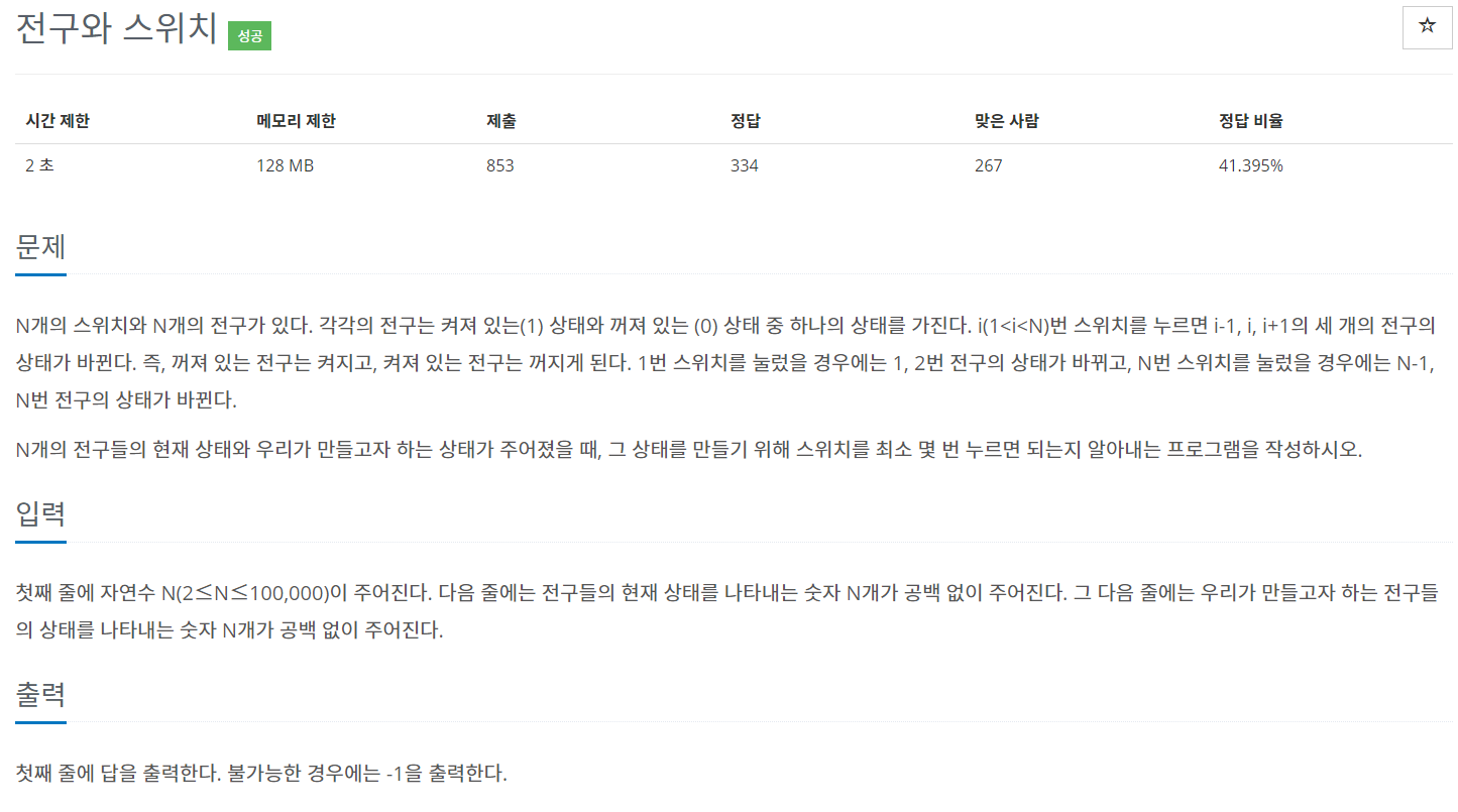 N개의 스위치와 N개의 전구가 있다. 각각의 전구는 켜져 있는(1) 상태와 꺼져 있는 (0) 상태 중 하나의 상태를 가진다. i(1<i<n)번 스위치를="" 누르면="" i-1,="" i,="" i+1의="" 세="" 개의="" 전구의="" 상태가="" 바뀐다.="" 즉,="" 꺼져="" 있는="" 전구는="" 켜지고,="" 켜져="" 꺼지게="" 된다.="" 1번="" 눌렀을="" 경우에는="" 1,="" 2번="" 바뀌고,="" n번="" n-1,="" n개의="" 전구들의="" 현재="" 상태와="" 우리가="" 만들고자="" 하<="" p=""> </i<n)번>