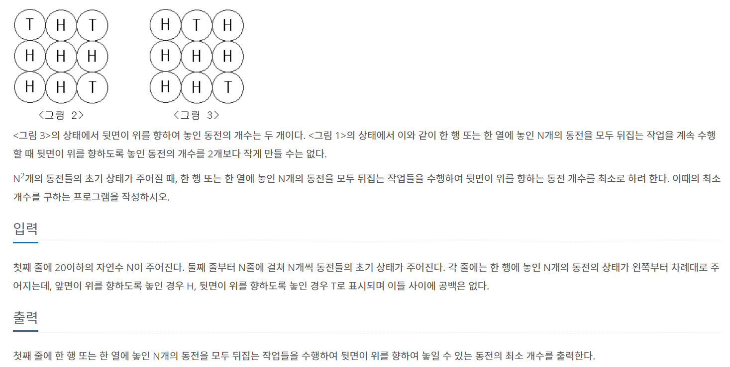 첫째 줄에 20이하의 자연수 N이 주어진다. 둘째 줄부터 N줄에 걸쳐 N개씩 동전들의 초기 상태가 주어진다. 각 줄에는 한 행에 놓인 N개의 동전의 상태가 왼쪽부터 차례대로 주어지는데, 앞면이 위를 향하도록 놓인 경우 H, 뒷면이 위를 향하도록 놓인 경우 T로 표시되며 이들 사이에 공백은 없다.