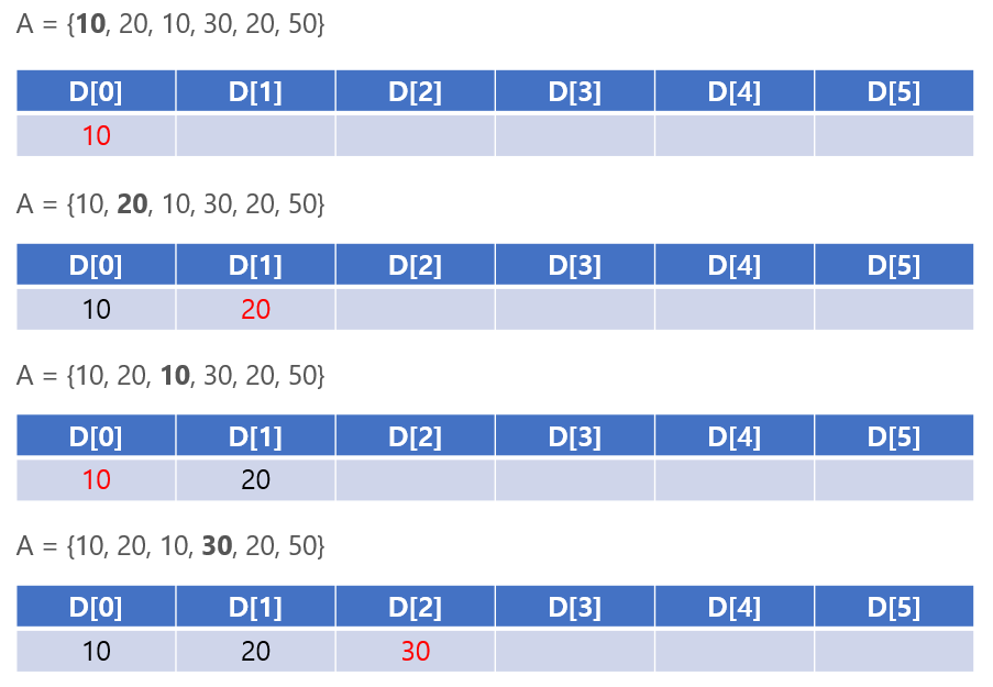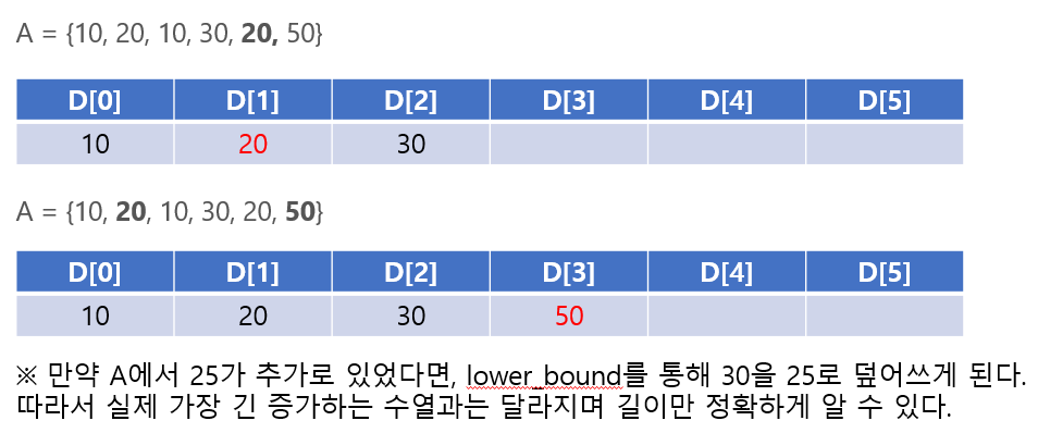 - 따라서, 1차원 배열을 이용해 lower_bound()로 현재 A 원소와 같거나 더 큰 D 원소를 찾아, 존재하면 덮어쓰고 없으면 추가해주는 방식으로 "길이만" 정확하게 구할 수 있다.