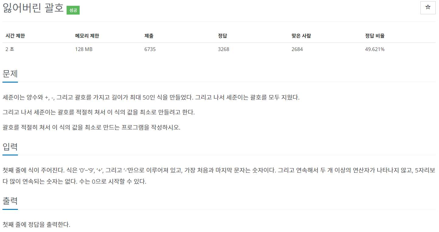 첫째 줄에 식이 주어진다. 식은 ‘0’~‘9’, ‘+’, 그리고 ‘-’만으로 이루어져 있고, 가장 처음과 마지막 문자는 숫자이다. 그리고 연속해서 두 개 이상의 연산자가 나타나지 않고, 5자리보다 많이 연속되는 숫자는 없다. 수는 0으로 시작할 수 있다.