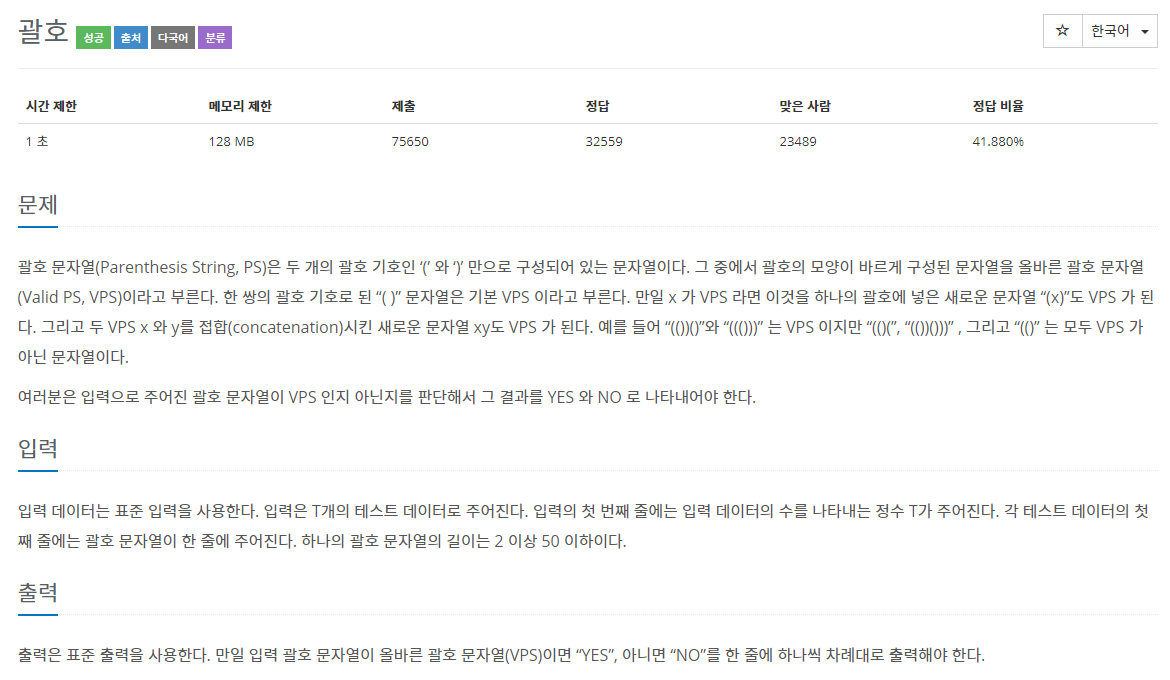괄호 문자열(Parenthesis String, PS)은 두 개의 괄호 기호인 ‘(’ 와 ‘)’ 만으로 구성되어 있는 문자열이다. 그 중에서 괄호의 모양이 바르게 구성된 문자열을 올바른 괄호 문자열(Valid PS, VPS)이라고