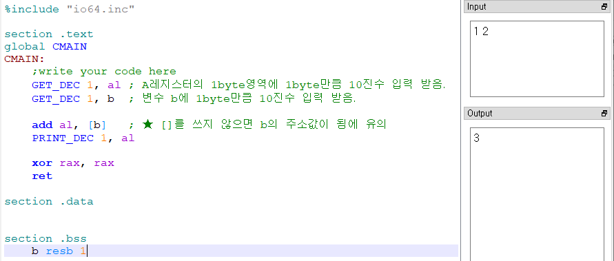 Q) 레지스터 A에 1byte를 입력받고, 초기화 되지 않은 전역변수 B에 1byte를 입력받아 A + B를 계산하는 프로그램을 작성하시오.