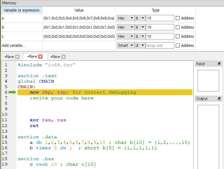 data section에 1byte 원소 10개를 갖는 a배열 선언하기. 초기값은 1-10으로 정의