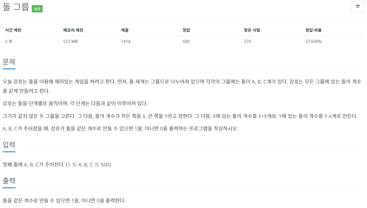 예제 입력 1 10 15 35 예제 출력 1 1 예제 입력 2 1 1 2 예제 출력 2 0 https://www.acmicpc.net/problem/12886 12886번: 돌 그룹 오늘 강호는 돌을 이용해 재미있는 게임을 하려고 한다. 먼저, 돌 세개는 그룹으로 나누어져 있으며 각각의 그룹에는 돌이 A, B, C개가 있다. 강호는 모든 그룹에 있는 돌의 개수를 같게 만들려고 한다. 강호는 돌을 단계별로 움직이며, 각 단계는 다음과 같이 이루어져 있다. 크기가 같지 않은 두 그룹을 고른다. 그 다음, 돌의 개수가 작은 쪽을 X, 큰 쪽을 Y라고 정한다. 그 다음, X에 있는 돌의 개수를 X+X개로, Y에 있는 돌의 개수를 Y-X개로 www.acmicpc.net - 시간 복잡도 + 공간 복잡도를 줄이기 위..