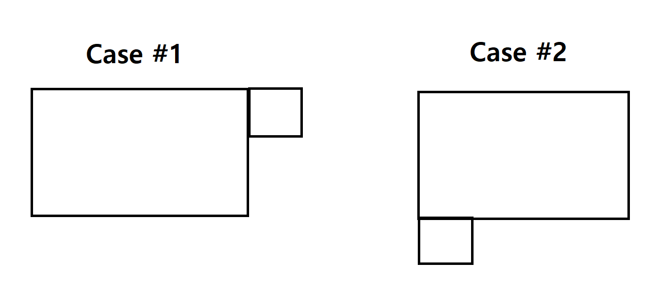 - 직접 배열에 붙여보면서 하지 않아도 된다. 스티커는 주어진 스티커에서 2개만 뽑아서 가장 넓게 붙여라는 것이 문제의 조건이었으므로, 아래와 같이 Case #1, #2로 모눈종이 안에 들어오는지 체크하고 들어온다면 넓이를 계산하여 최대값을 저장한다.